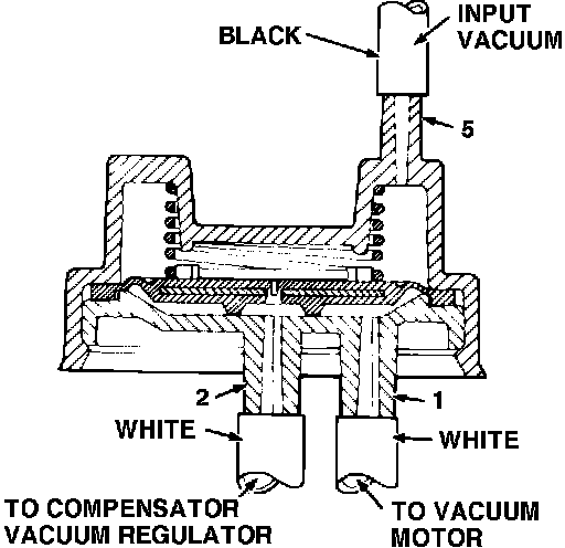 Whenever engine vacuum drops to within 1-1/2 inches or less of control vacuum, the spring-loaded diaphragm is pushed against the base of ports 1 and 2, sealing port 1. The vacuum motor is locked in position until engine vacuum is restored. When engine vacuum increases, the vacuum relay opens and system control resumes. This prevents the programmer from going to full cold operation whenever low engine vacuum conditions occur.