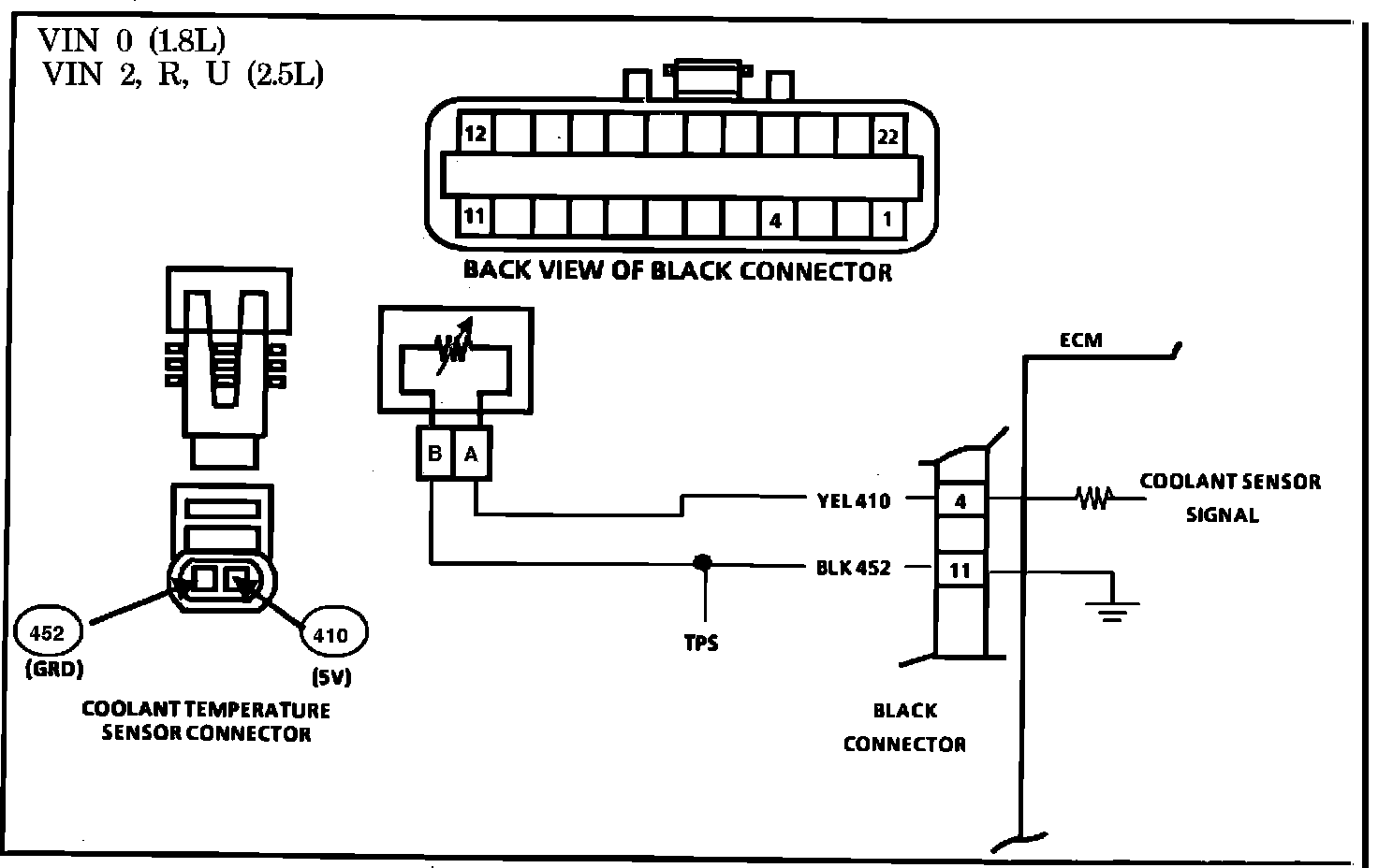 2. If checking resistance at the coolant sensor is difficult because of sensor location, disconnect black ECM connector and check resistance between connector terminals 4 and 11.