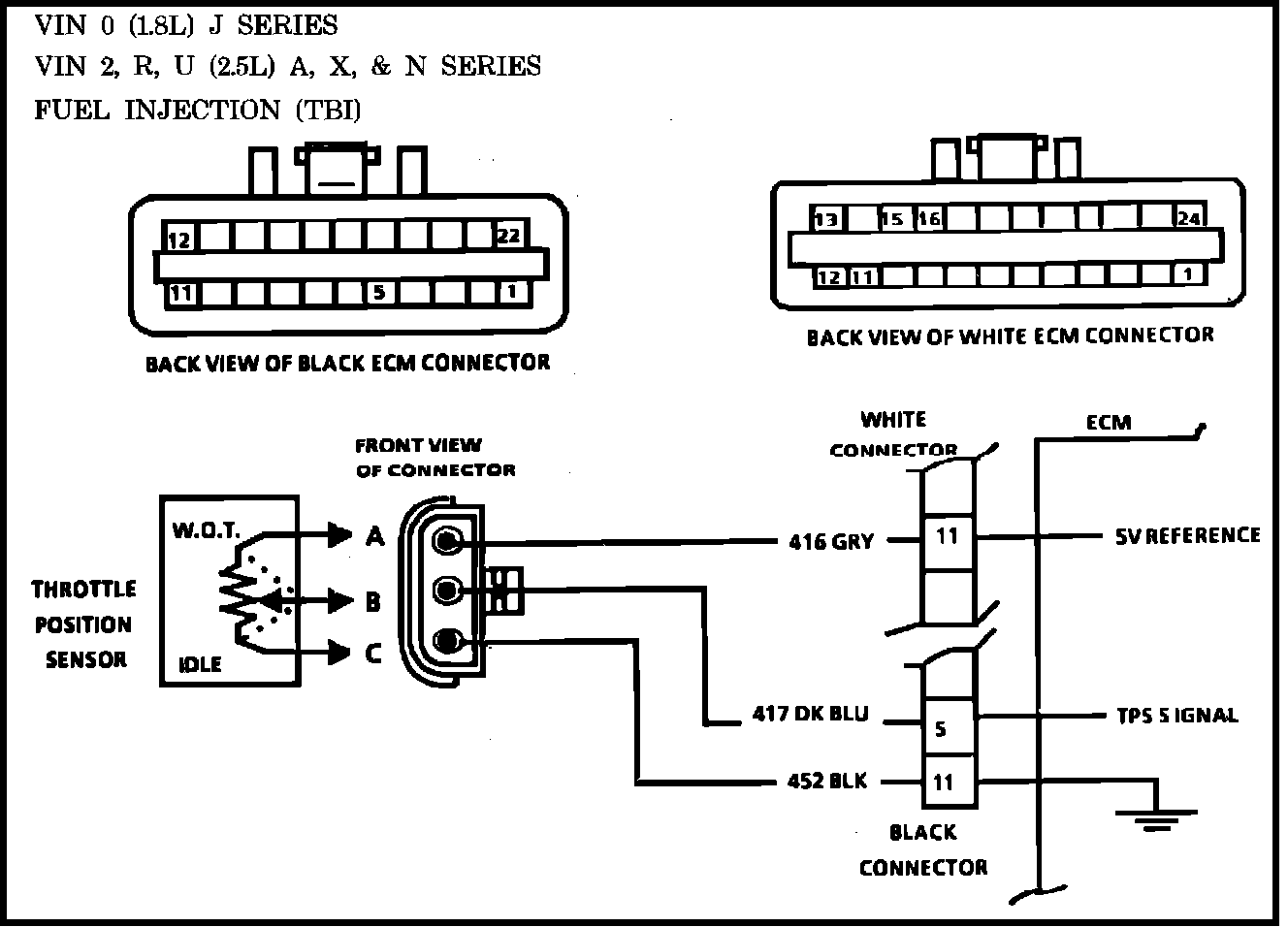 The Throttle Position Sensor (TPS) provide a voltage signal that changes relative to the throttle valve. Signal voltage vary from less than 1.25 volts at idle to 4.5 volts at wide open throttle and is non-adjustable.