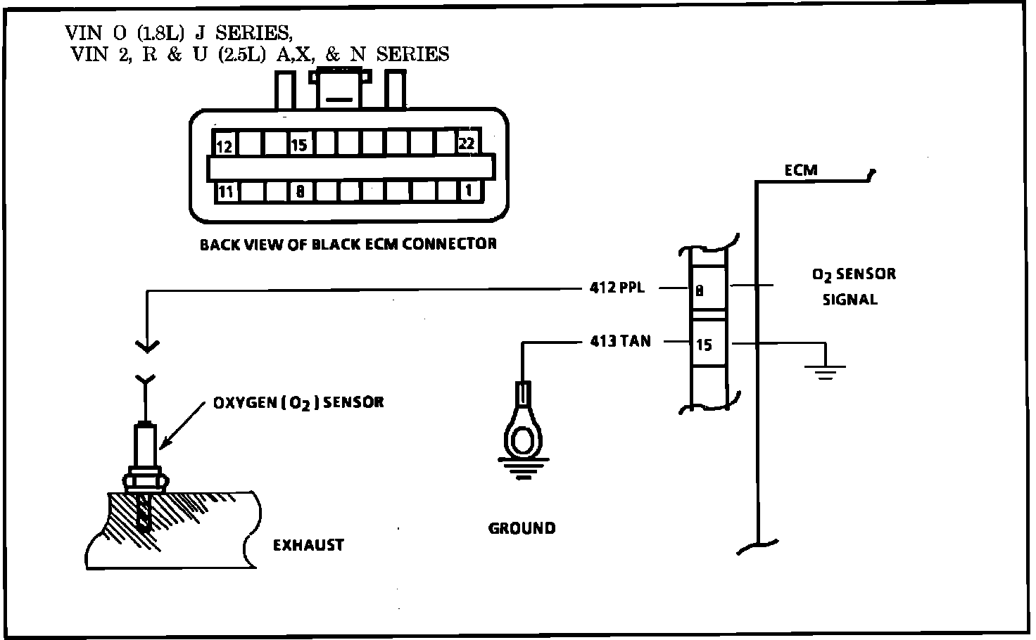 The ECM supplies a voltage of about .45 volt between Circuits 412 and 413. (If measured with a 10 megohm digital voltmeter, this may read as low as .32 volts.) The O2 sensor varies the voltage within a range of about 1 volt if the exhaust is rich, down through about .10 volt if exhaust is lean.