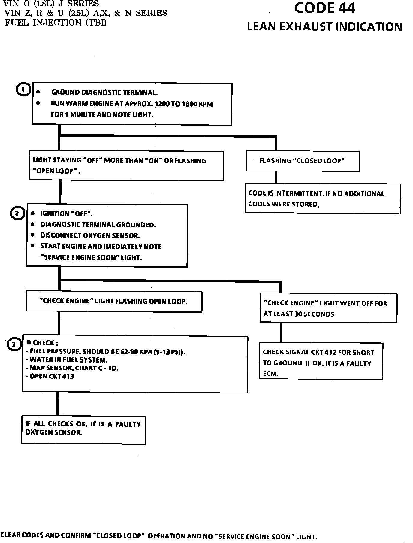 f. If the above are OK, and the instructions at the top of the chart will still set a Code 44, or "SERVICE ENGINE SOON" light is "OFF" more than "ON", or flashing "OPEN LOOP", it is a faulty Oxygen Sensor.