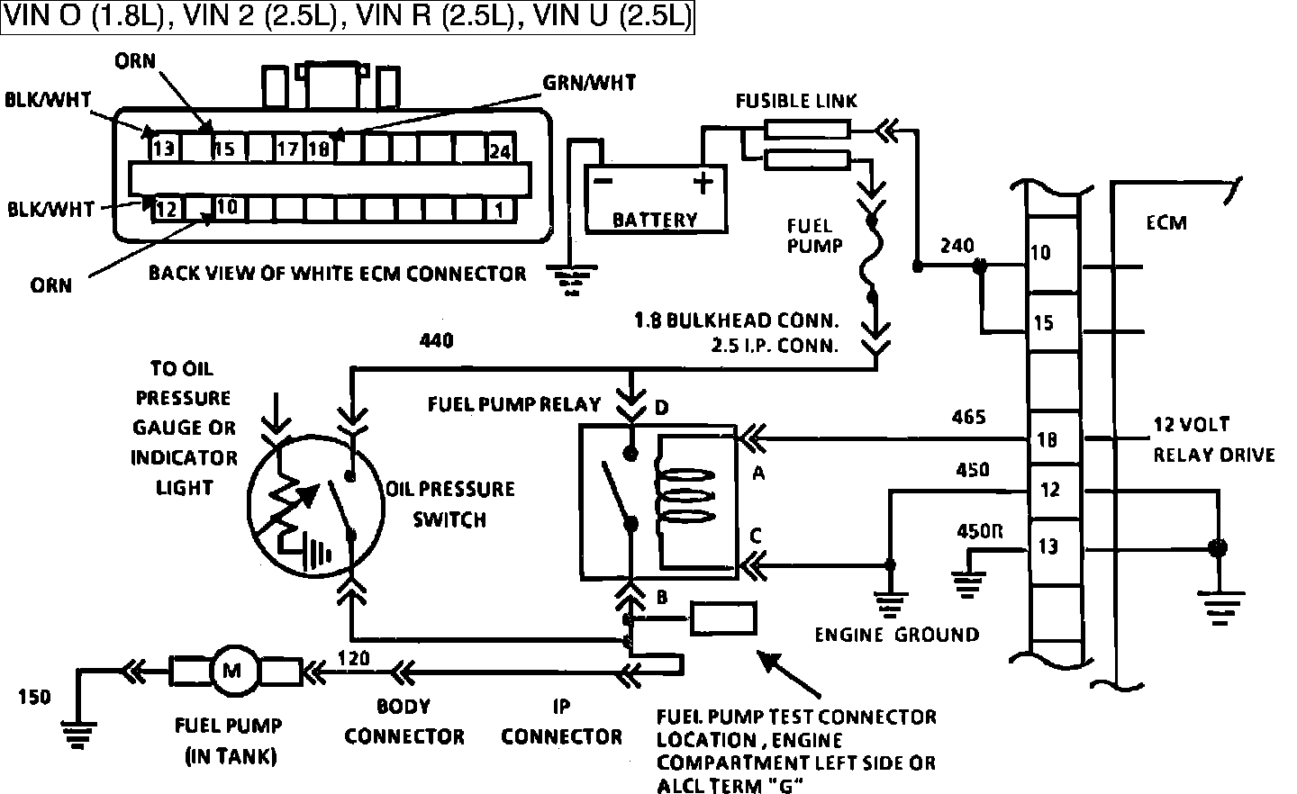 When the ignition switch is turned "ON", the Electronic Control Module (ECM) will turn "ON" the in-tank fuel pump. It will remain "ON" as long as the engine is cranking or running, and the ECM is receiving HEI distributor reference pulses.