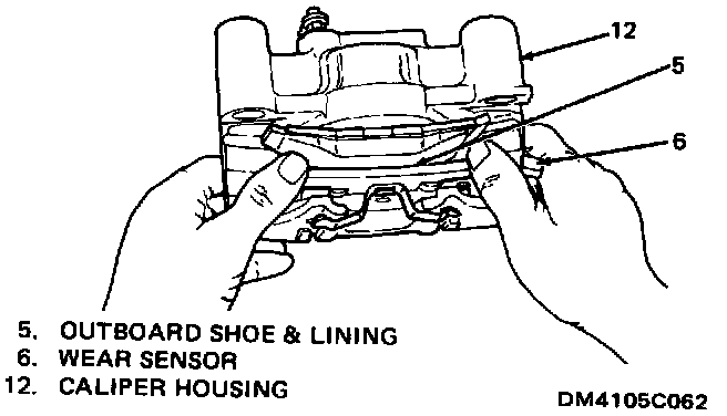 NOTE: If an outboard shoe is removed from the caliper, or the tabs unclinched for any reason, then it will be necessary to replace the shoe and lining assemblies. Do not re-clinch outboard shoe locking tabs after having removed shoe from caliper.