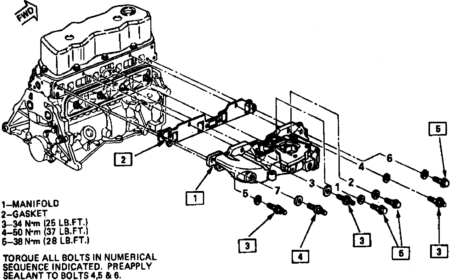 11. Reverse procedure to install. Torque attaching bolts to specifications in sequence shown in Figs. 4 and 5. On 1987---88 models, torque all attaching bolts to 25 ft. lbs.