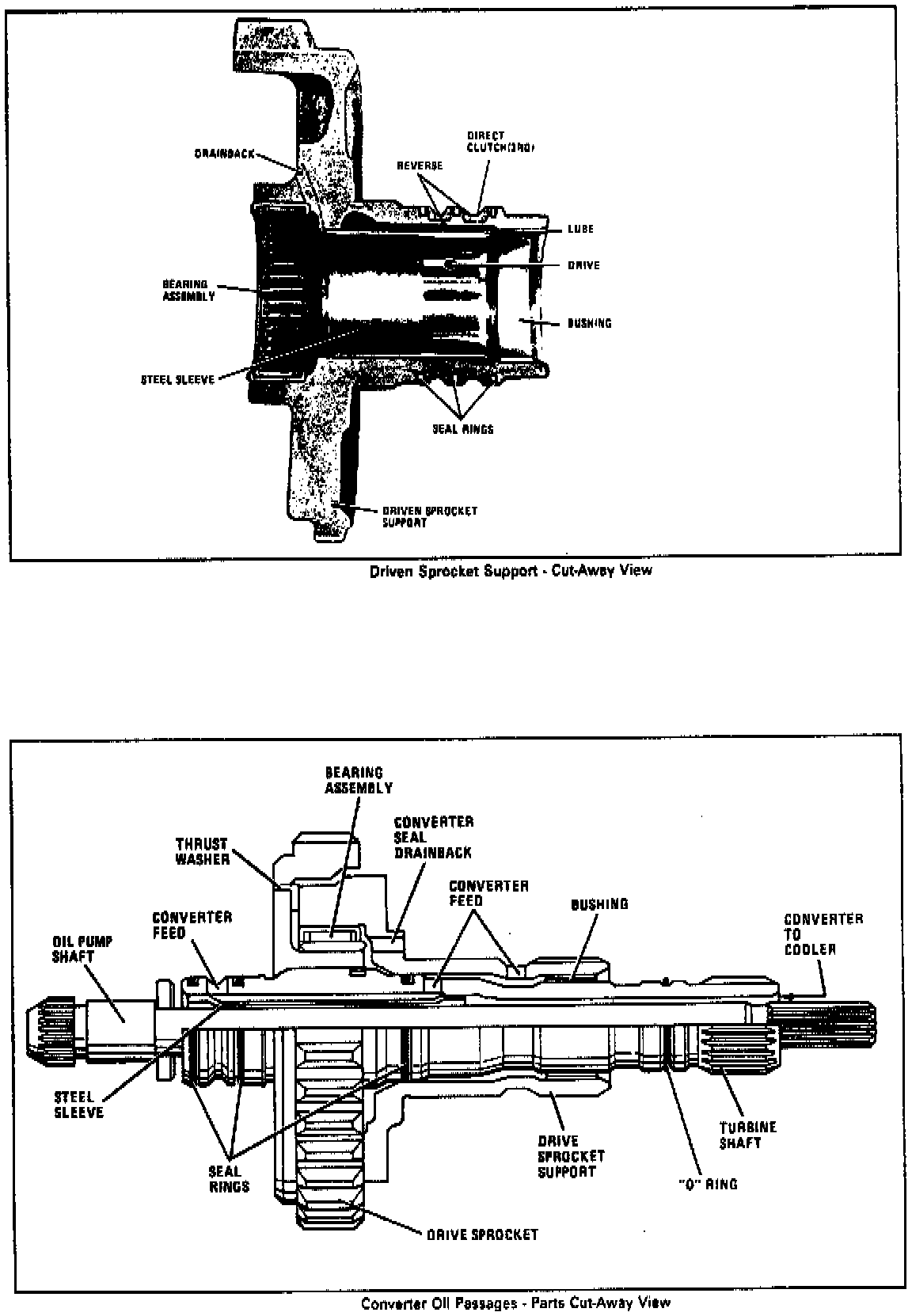 The correction is to inspect both of the sprocket bearings any time a noise is present. These bearings will make a noise when the vehicle is moving, or in park or neutral when the sprockets are turning. Inspect the bearings and the sprocket races for pitting or damage.