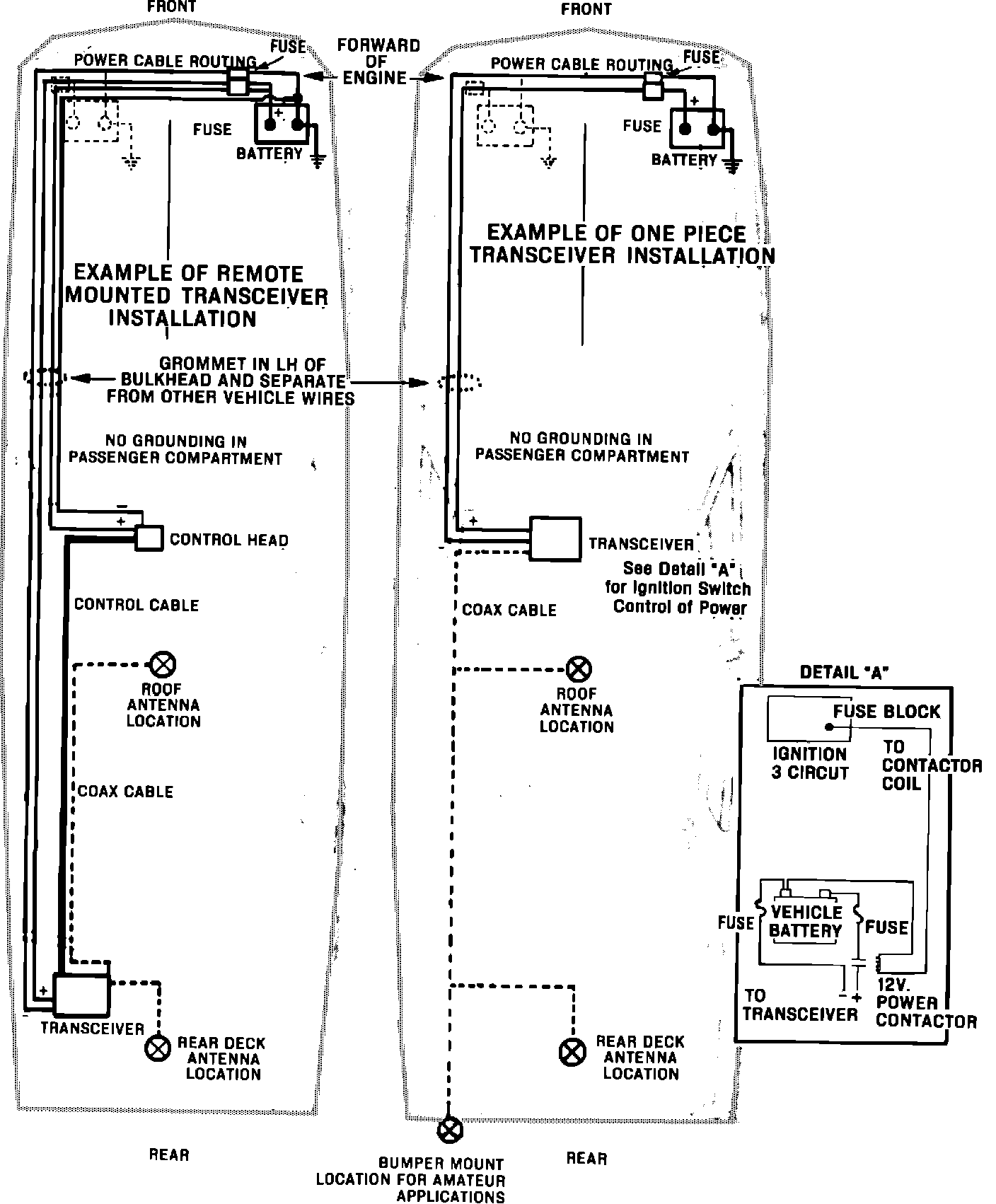 connected directly to the battery. Any ground lead from a handset or control unit must return to battery negative. If it is necessary that the transceiver power be controlled by the ignition switch, then handset or control unit battery lead may be connected to the ignition 3 circuit at a terminal so labeled on the vehicle fuse block. A sketch of the fuse block is located in the owners manual. For ONE PIECE TRANSCEIVERS, where ignition switch control is necessary, a 12v power contactor must be installed in the transceiver battery lead. The contactor should be located at the vehicle battery with the coil of the contactor driven from the ignition three circuit at the fuse block. The coil of the contactor must return to battery negative