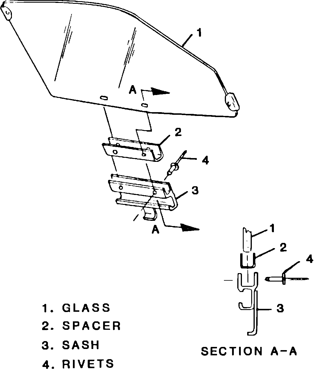 3. Connect sash and spacer to glass using 3/16" x .527" aluminum domehead blind rivets available through GM Parts System, part number 9441725, or Cherry part number BAPV-67 or equivalent.
