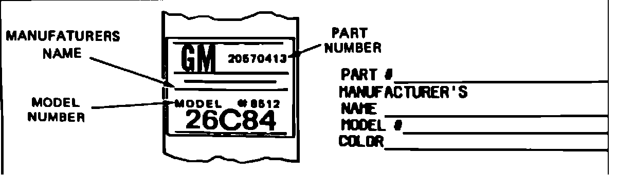 2. Part number, if shown, Manufacturer's Name and Model Number that appears on the label of the seat belt assembly along with the color of the webbing. Colored extenders for past model vehicles are furnished on an "as material available basis" only. If webbing of the color designated for a past model vehicle is not available, the extension will be furnished in black.