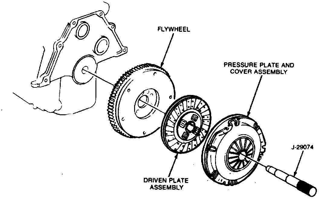 9. Place pressure plate and driven disc in position and support with tool No. J-29074. The driven disc is installed with the damper springs offset toward the transaxle. Stamped letters found on the driven disc identify the "Flywheel Side."