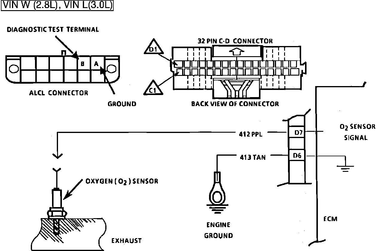 The ECM supplies a voltage of about .45 volt between terminals "D7" and "D6". (If measured with a 10 megohm digital voltmeter, this may read as low as .32 volts.) The O2 sensor varies the voltage within a range of about 1 volt if the exhaust is rich, down through about .10 volt if exhaust is lean.