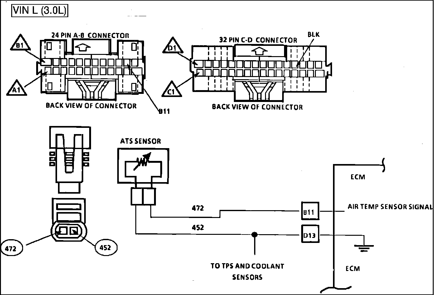 The ATS Sensor uses a thermistor to control the signal voltage to the ECM. The ECM applies a voltage (4-6 volts) on CKT 472 to the sensor. When the air is cold the sensor (thermistor) resistance is high, therefore the ECM will see a high signal voltage. If the air is warm the sensor resistance is low therefore the ECM will see a low voltage.