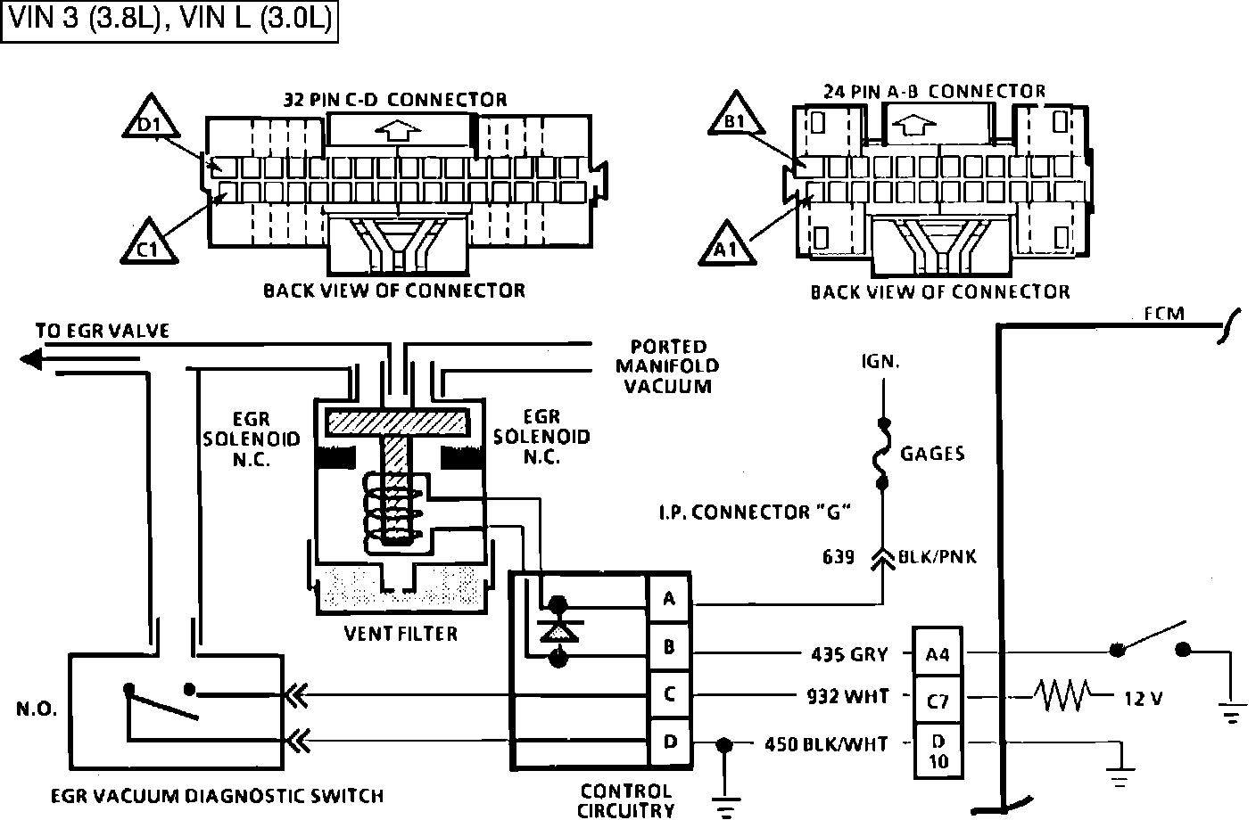 The EGR Vacuum Control has an ECM controlled solenoid that pulses manifold vacuum to the EGR valve. The solenoid is always de-energized (EGR off) in "park" or "neutral" and at idle. Another part of the control is a vacuum diagnostic switch which is open with no vacuum applied. Its purpose is to signal the ECM when vacuum is actually being applied to the EGR valve.