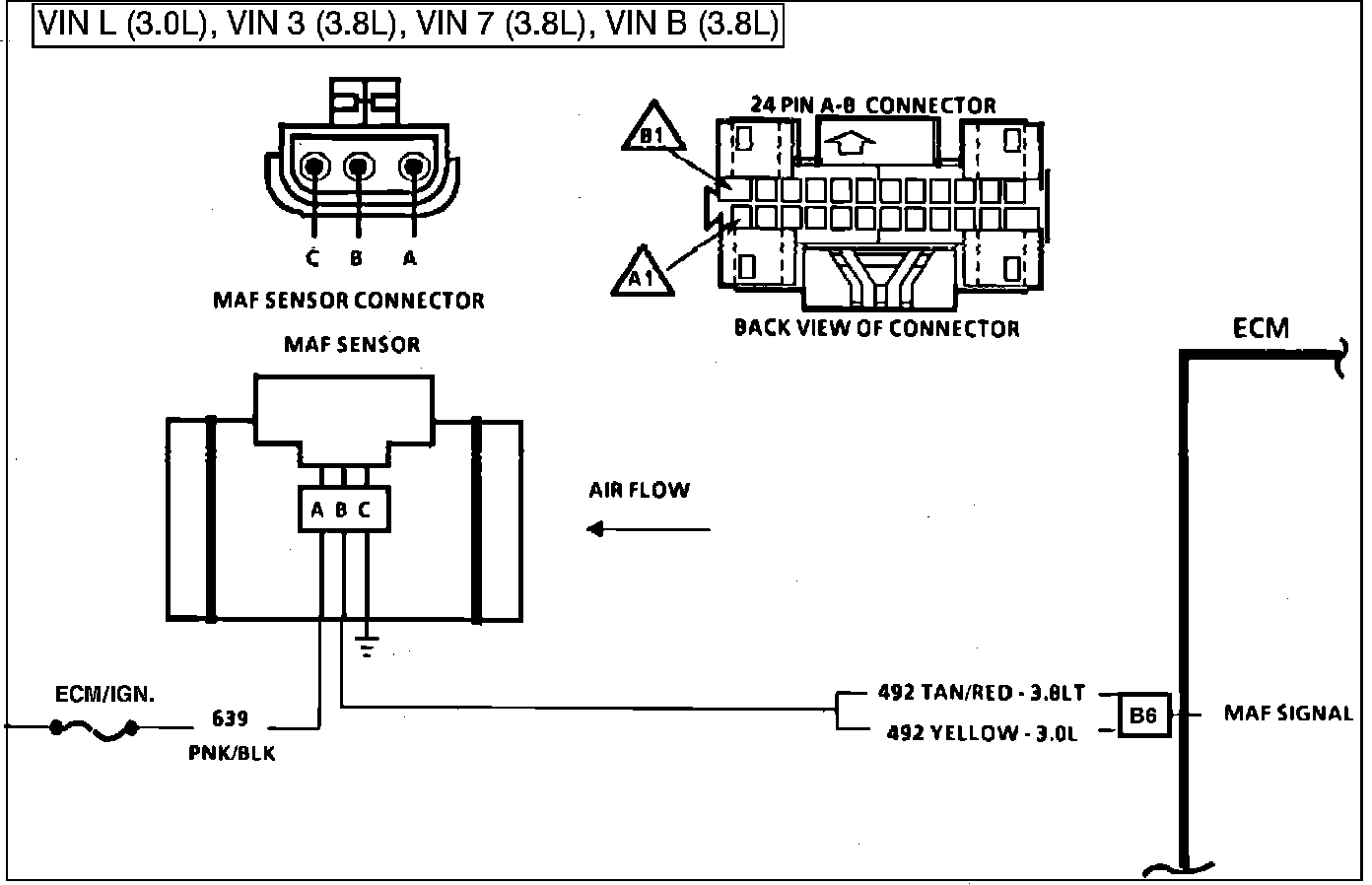 Fig. 023 - WIRING DIAGRAM for Code 33 Mass Air Flow Sensor. VIN L, VIN 3, VIN 7, VIN B: