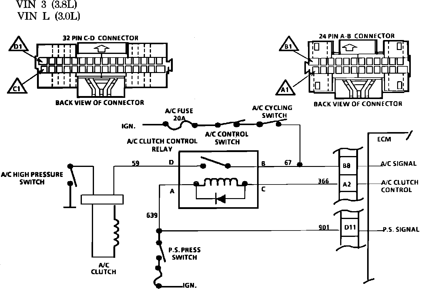 The A/C clutch control relay is ECM controlled to delay A/C clutch engagement .4 seconds after A/C is turned on. This allows the IAC to adjust engine RPM before the A/C clutch engages. The ECM also causes the relay to disengage the A/C clutch during WOT operation. The A/C clutch control relay is energized when the ECM provides a ground path for CKT 366.