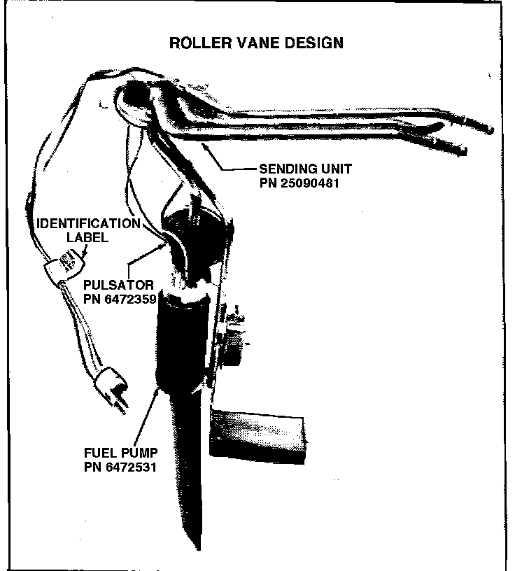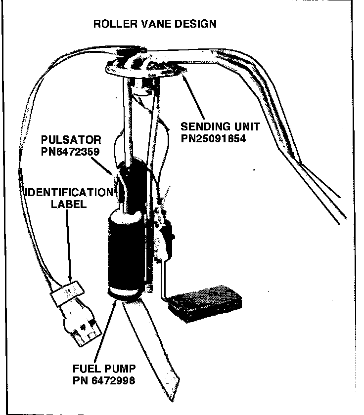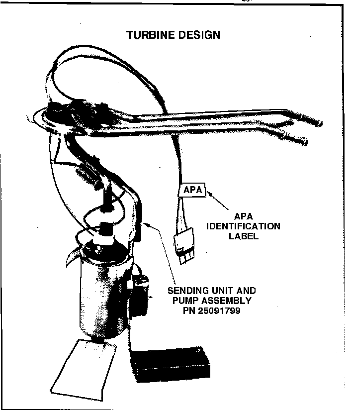 This design fuel pump and sender must be replaced as an assembly. The fuel pump and sender cannot be ordered separately. It can be identified prior to removal from the tank by an APA identification label.