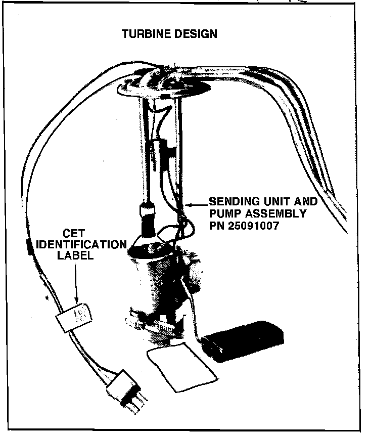 This design fuel pump and sender must be replaced as an assembly. The fuel pump and sender cannot be ordered separately. It can be identified prior to removal from the tank by a CET identification label.