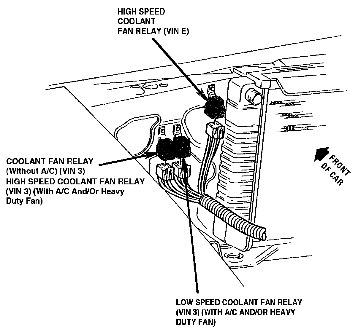The Coolant Fan Relay is located in the LH front of engine compartment, on the LH side of Radiator.