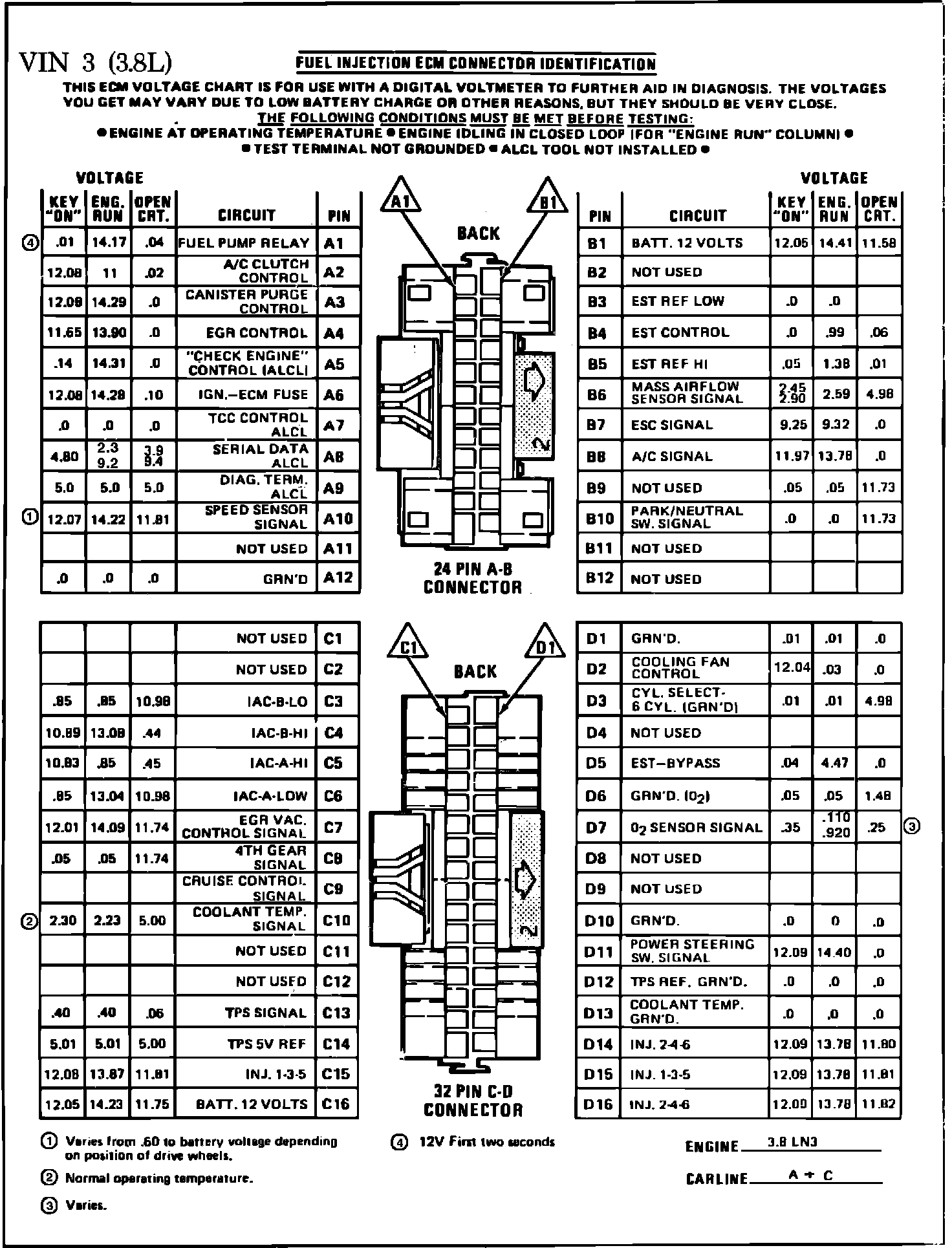 Fig. 010 ECM Connector Terminal Identification & Voltage Specifications: