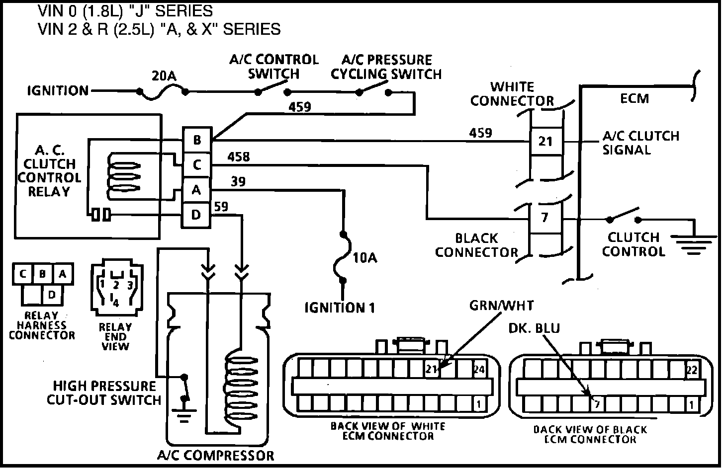 Turning on air conditioning supplies CKT 459 battery voltage to the clutch control relay and terminal 21 of the white ECM connector. After a time delay of about 1/2 second the ECM will ground terminal 7 of the black ECM connector, CKT 458, and close the control relay.
