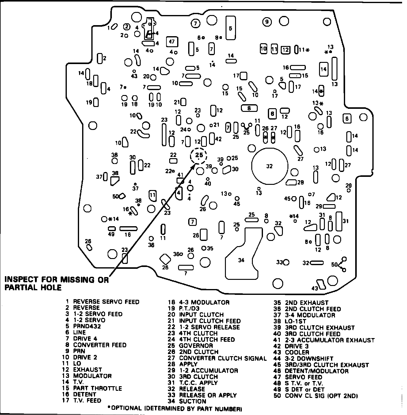 Harsh 3-2 and 4-2 shifts at any altitude may be caused by a missing or partial hole in the spacer plate. Remove the valve body and inspect the spacer plate for a missing or partial governor passage hole (No. 25) as shown in Figure 3. A partial hole can be drilled out using a No. 77 drill bit to meet the hole size requirement of .46 mm (.018"). If the hole is missing, use the spacer plate gasket and control valve body as a guide to locate and drill the hole, or replace the spacer plate.