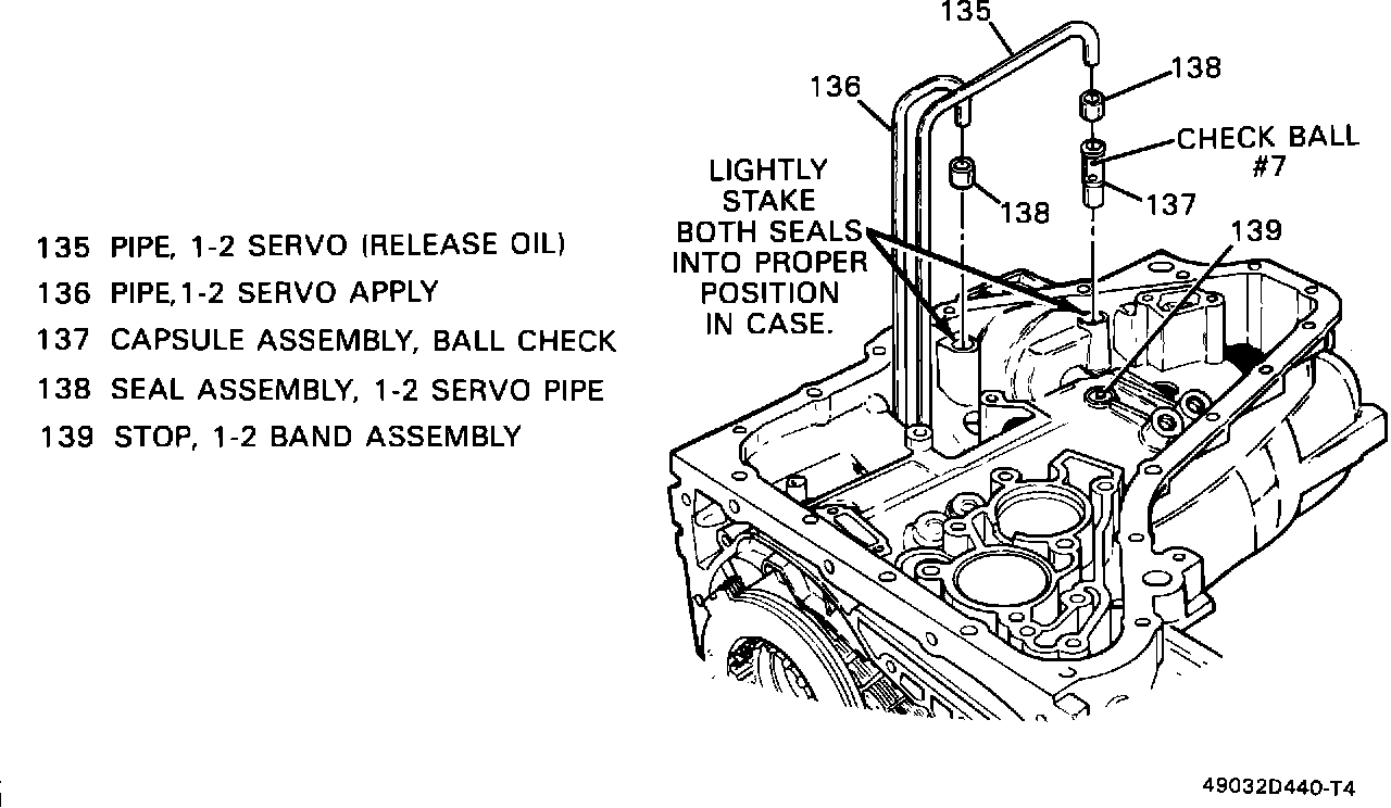 If fluid condition is proper, inspect the servo pipe seals at both ends of each pipe and the 1-2 servo piston seals. The original pipes can be reused in field service. Replace any damaged seal as outlined in the appropriate chassis service manual. Refer to the following list for service part numbers: