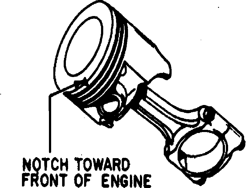 Install piston and rod assembly so that notch at top of piston is facing toward front of engine, Fig. 35. Check connecting rod side clearance. Clearance should be .006-.020 inch on V8 engines or .008-.021 on V6 engines.