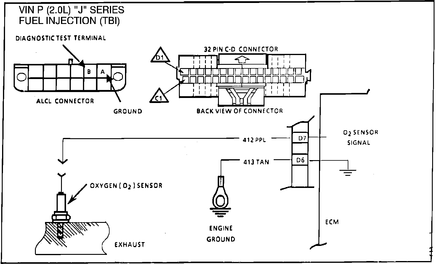 The ECM supplies a voltage of about .45 volt between terminals "D7" and "D6". (If measured with a 10 megohm digital voltmeter, this may read as low as .32 volts.) The O2 sensor varies the voltage within a range of about 1 volt if the exhaust is rich, down through about .10 volt if exhaust is lean.