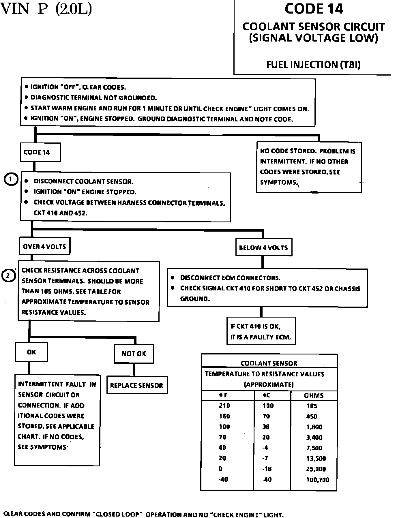 Code 14 will set if signal voltage indicates a coolant temperature above 135°C (275°F) for more than 10 (ten) seconds.