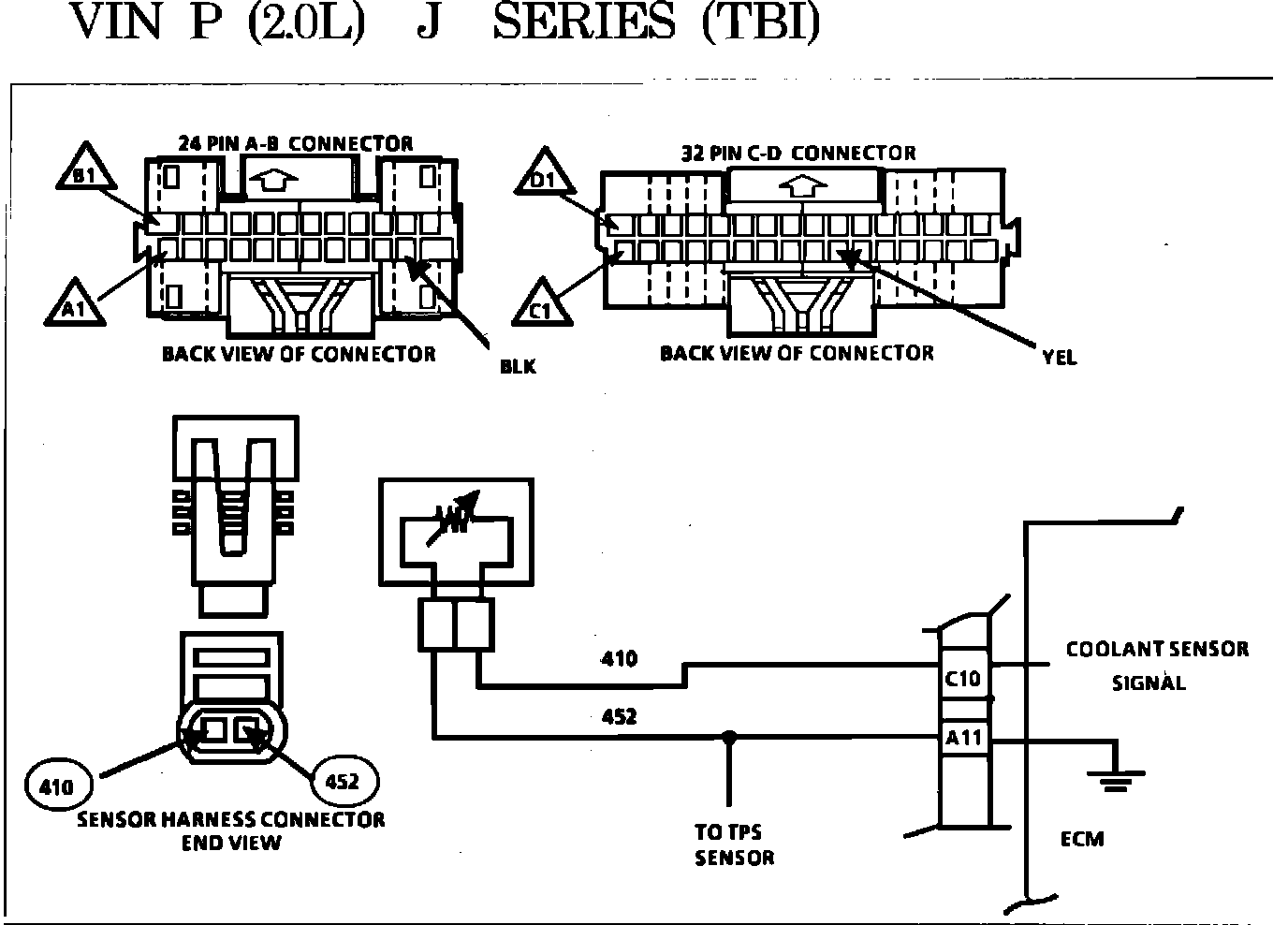 2. If checking resistance at the coolant sensor is difficult because of sensor location, disconnect the black ECM connectors and check resistance between harness connector terminals C10 and A11.