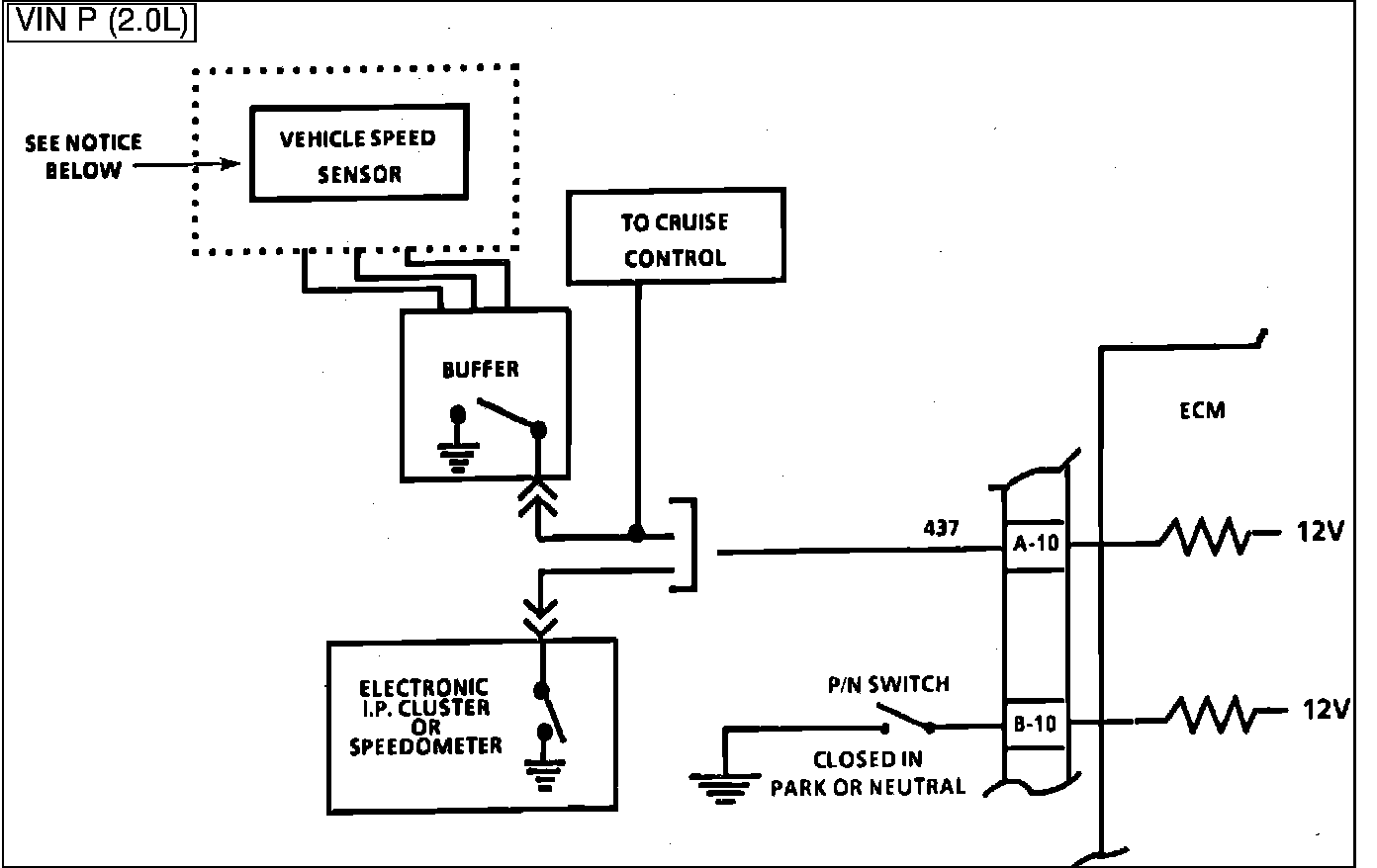 The ECM applies and monitors 12 volts on CKT 437. CKT 437 connects to the Vehicle Speed Sensor which alternately grounds CKT 437 when drive wheels are turning. This pulsing action takes place about 2000 times per mile and the ECM will calculate vehicles speed based on the time between "pulses".