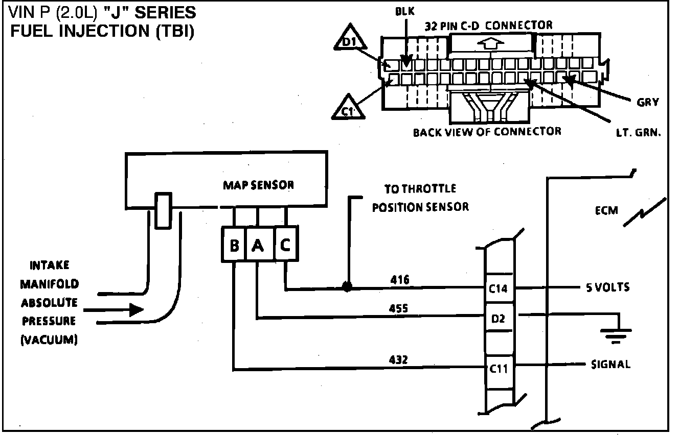The Manifold Absolute Pressure Sensor (MAP) responds to changes in manifold pressure (vacuum). The ECM receives this information as a signal voltage that will vary from about 1 to 1.5 volts at idle to 4-4.5 volts at wide open throttle.
