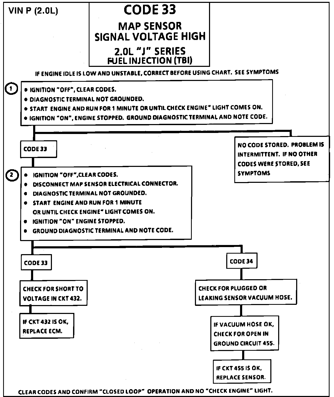 Engine misfire or a low unstable idle may set Code 33. Disconnect MAP sensor and system will go into backup mode. If the misfire or idle condition remains, See Symptoms