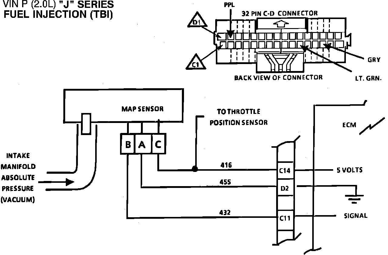 The Manifold Absolute Pressure Sensor (MAP) responds to changes in manifold pressure (vacuum). The ECM receives this information as a signal voltage that will vary from about 1 to 1.5 at idle to 4-4.5 volts at wide open throttle.