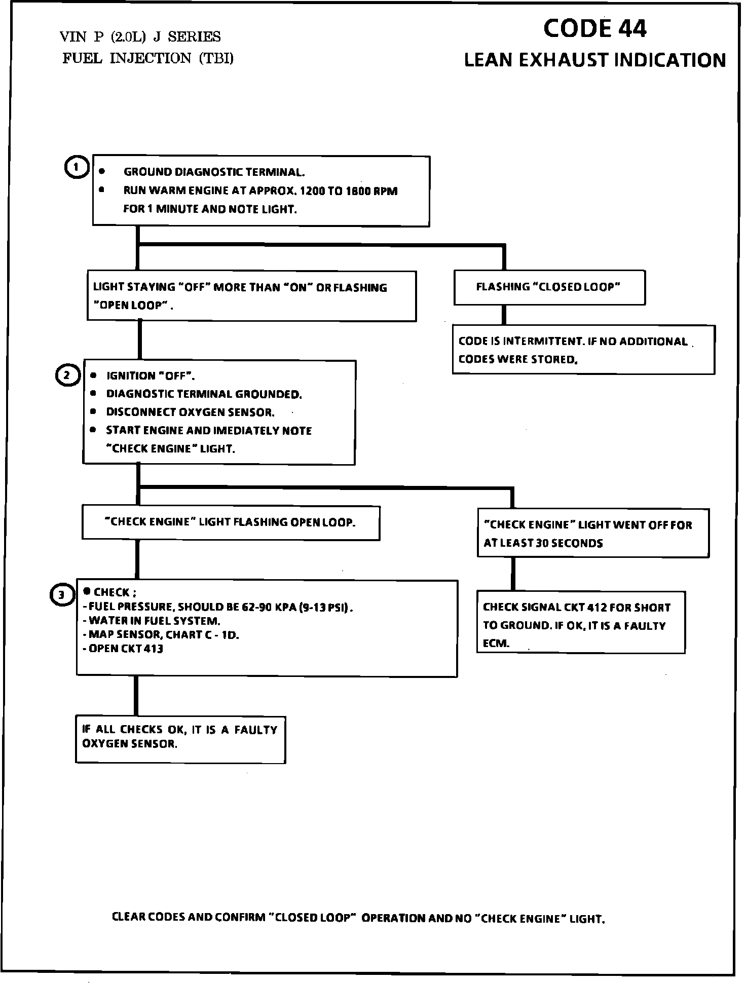 f. If the above are OK, and the instructions at the top of the chart will still set a Code 44, or "CHECK ENGINE" light is "OFF" more than "ON", or flashing "OPEN LOOP", it is faulty Oxygen Sensor.
