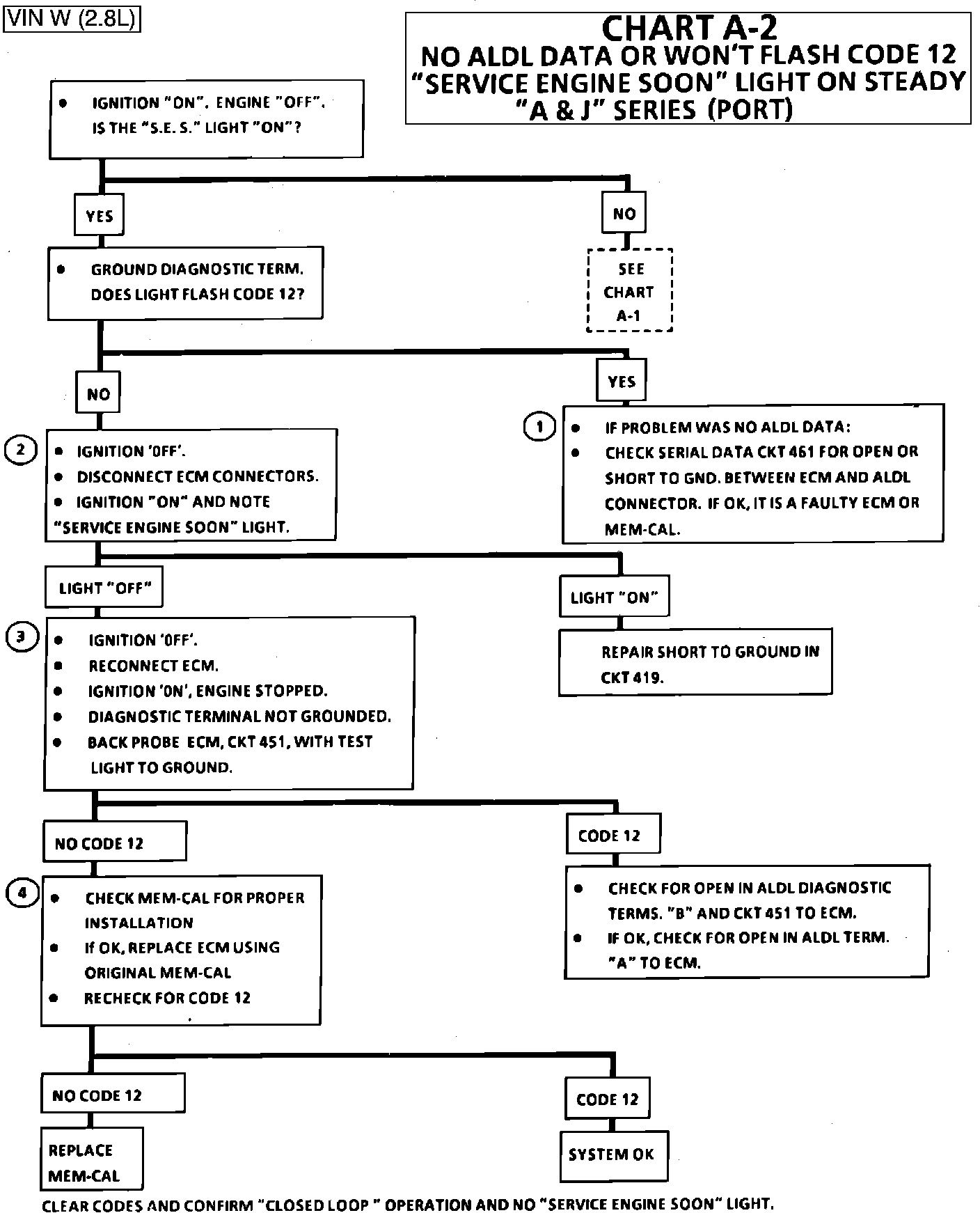 4. At this point the "Service Engine Soon" light wiring is OK. The problem is a faulty ECM or Mem-Cal. If Code 12 does not flash, the ECM should be replaced using the original Mem-Cal. Replace the Mem-Cal only after trying an ECM, as a defective Mem-Cal is an unlikely cause of the problem.