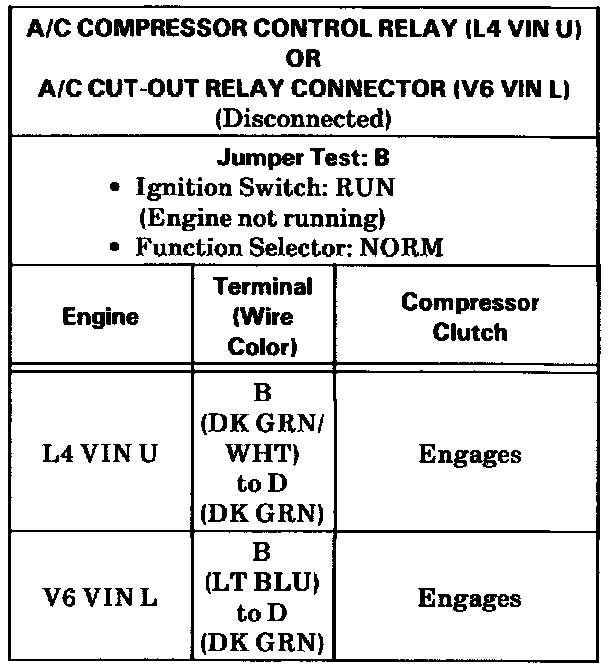 1. With the connector removed from the A/C Compressor Control Relay, connect a fused jumper between the terminals given in the table. Turn the A/C Function Selector to NORM and the Ignition Switch to RUN but do not start the engine.