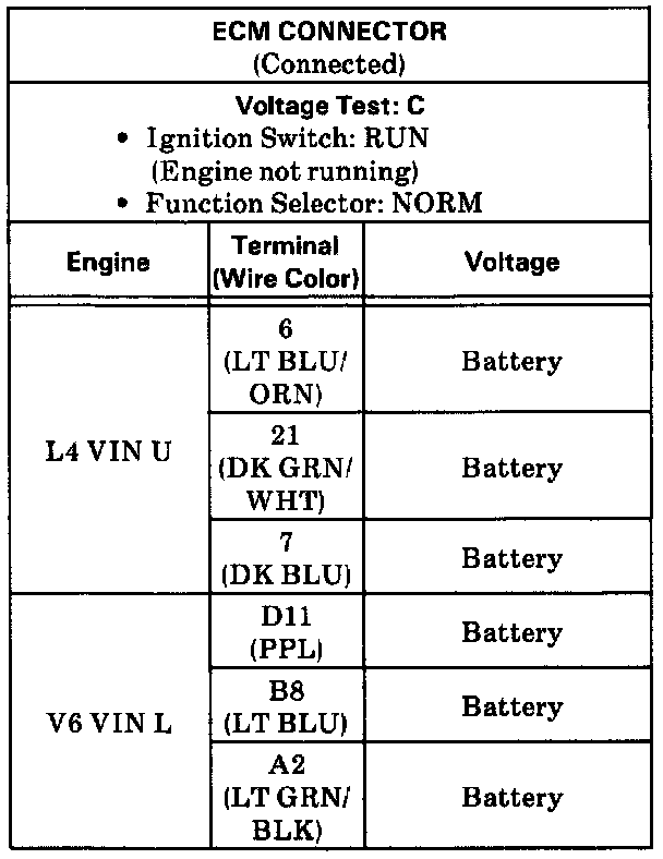 1. Measure the voltage to ground at the following terminals of the ECM. Leave the connector in place.