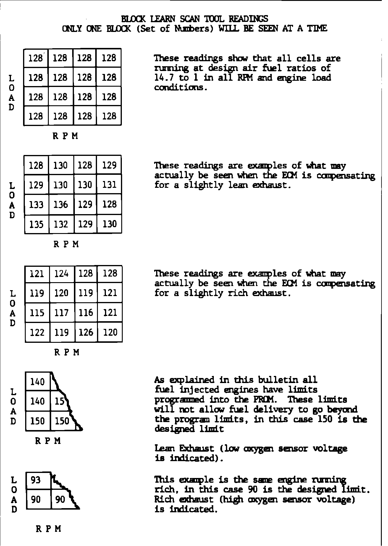 If an engine were operating at a theoretically average condition for which the computer is calibrated, both integrater and block learn would read 128. If the engine were running slightly rich, the block learn would be a little lower, for example 124, and the integrator would be 128. The farther the integrator and block learn numbers are from 128, the greater the change is in the mixture from the design intent. This means that block learn can be used to get an idea as to whether the system is running lean or rich.