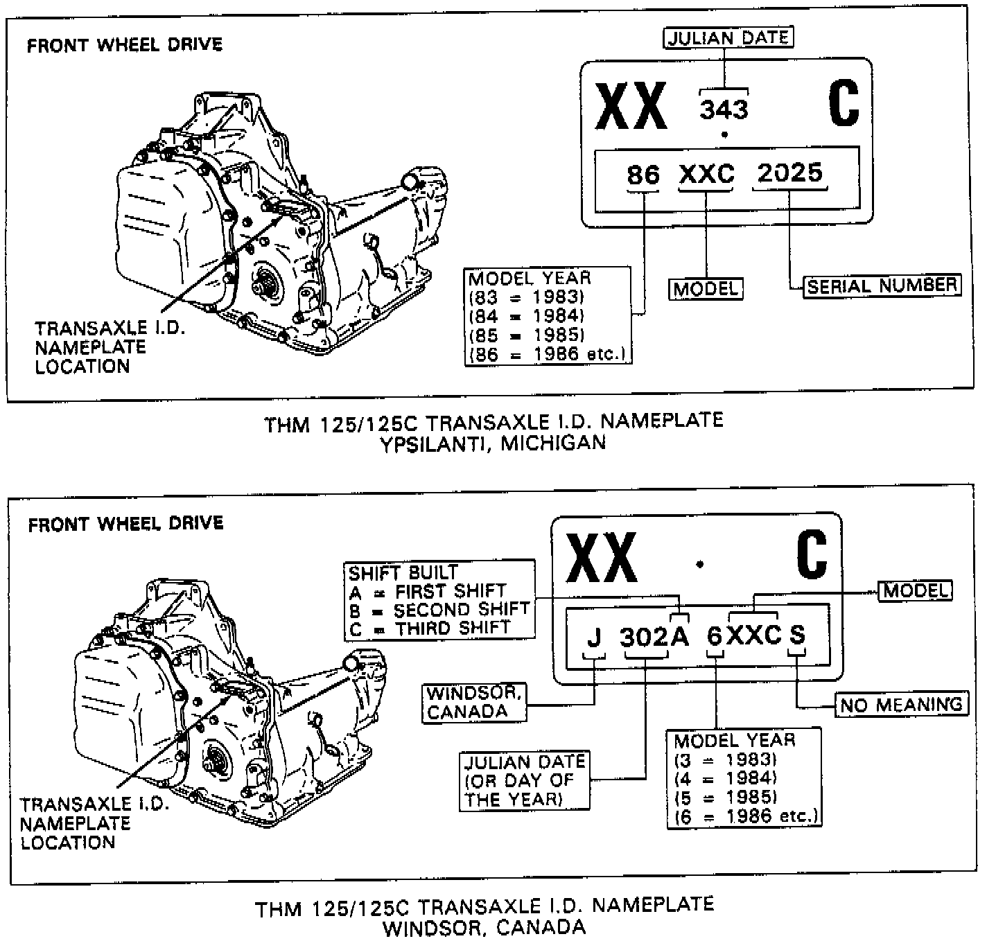 A 1985 or 1986 THM 125C transaxle built prior to October 29, 1985 (Julian Date 302) in Windsor, or prior to December 9, 1985 (Julian Date 343) in Ypsilanti, may exhibit a throttle valve buzz condition. Refer to above list for model/year applications. All of the models listed are 2.8L engine applications. Refer to Figure 1 for transaxle identification information.