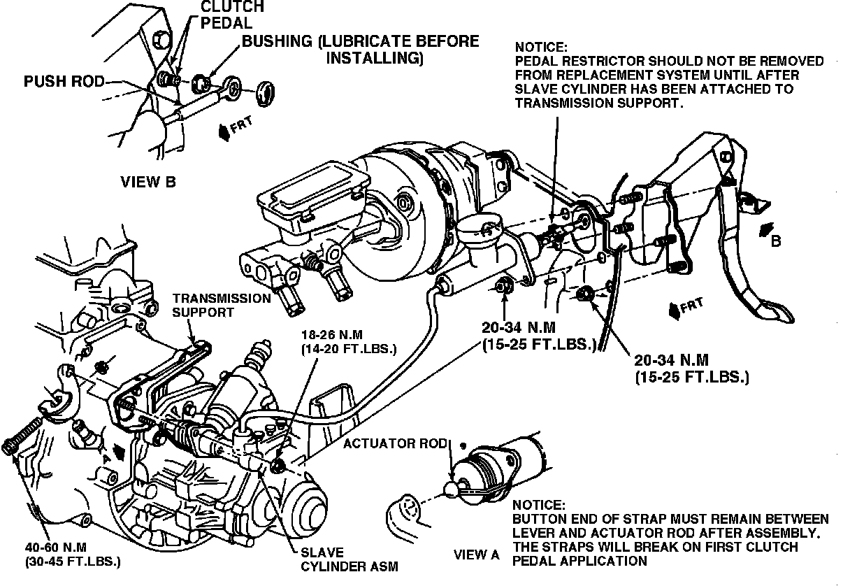 On these models, a hydraulic clutch system is used, Fig. 2. The system consists of a dash mounted master cylinder with integral reservoir, a transmission mounted slave cylinder and high pressure tubing to connect the two components.