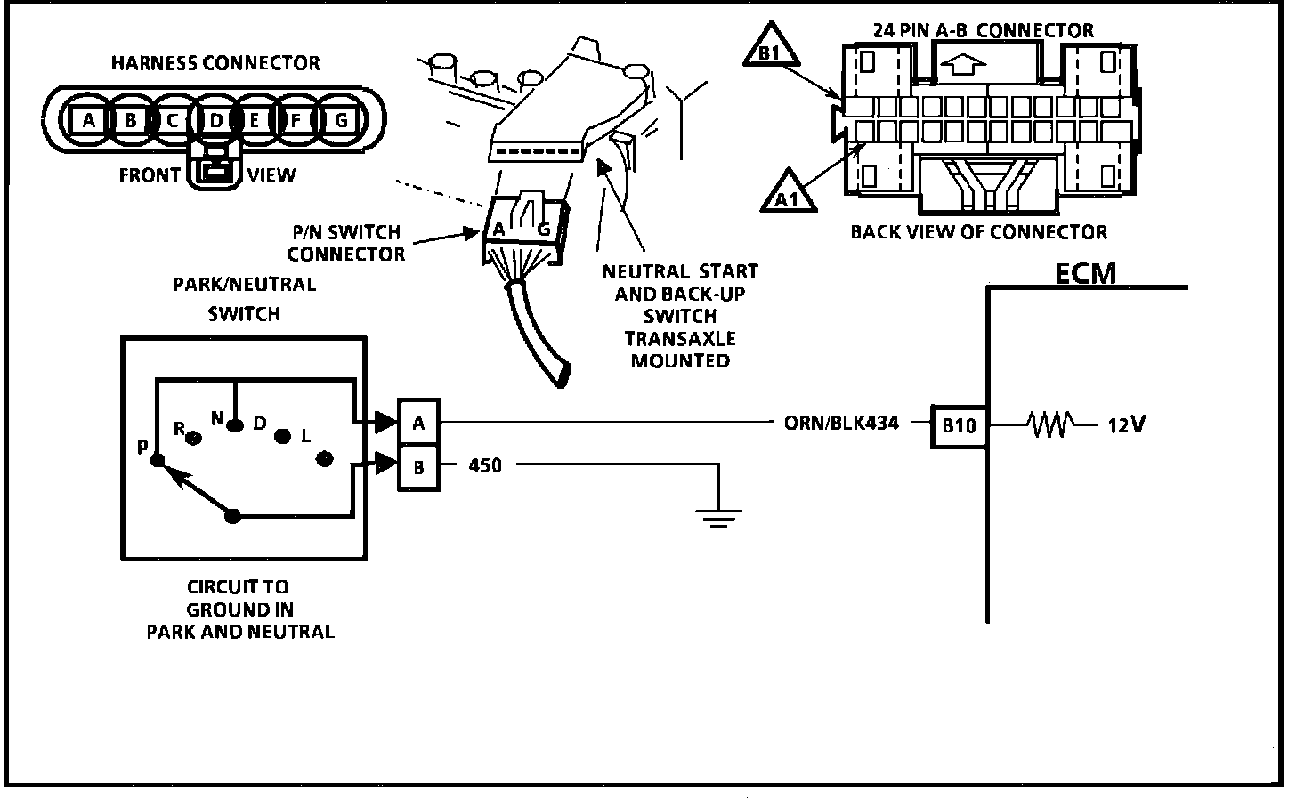 3. Checks to this point indicate the P/N switch and wiring are OK, however, the ECM signal voltage on CKT 434 may be missing. To check, reconnect ECM. Either back probe ECM connector CKT 434 with selector in drive or disconnect P/N switch and probe harness connector CKT 434 with a voltmeter to ground.