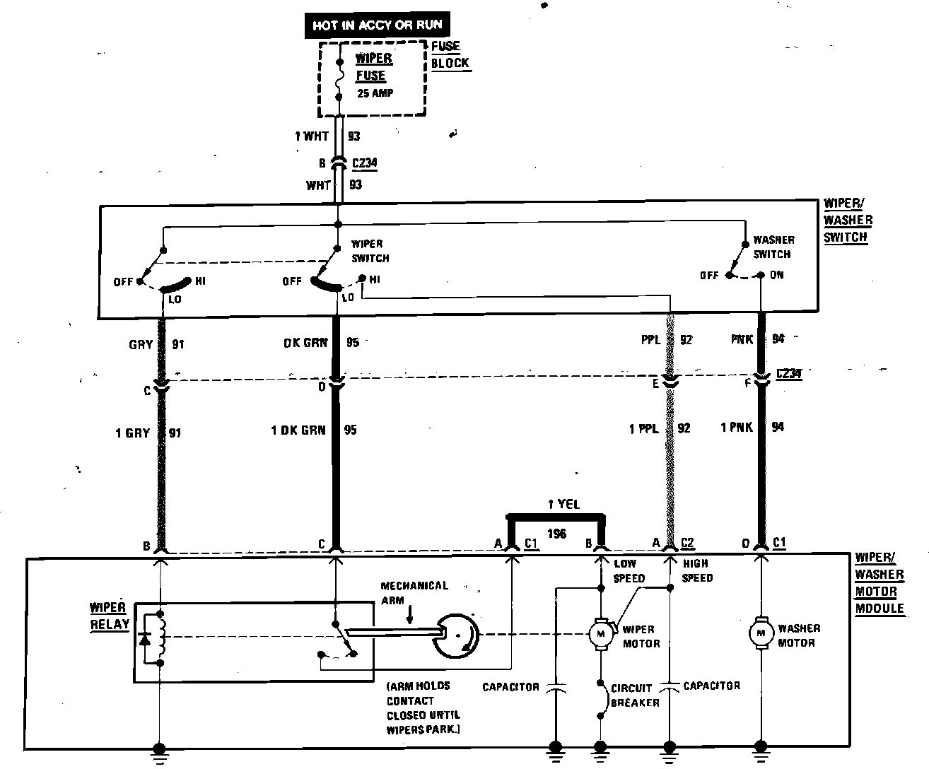 Windshield Wiper/Washer Wiring Circuit. Less Pulse Wipers: