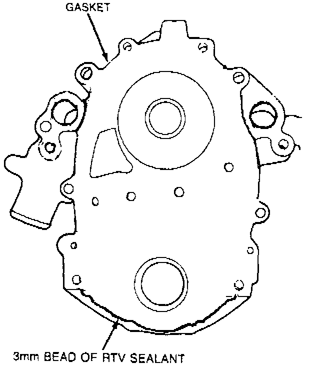2. Apply a continuous 3mm (1/8") bead of GM 1052917 RTV sealer or equivalent to oil pan sealing surface of Timing Cover.