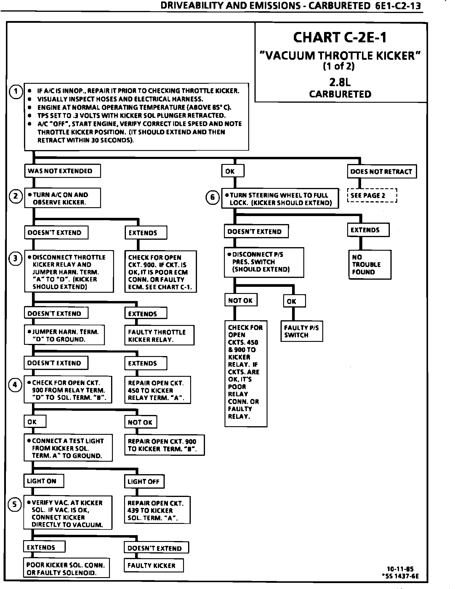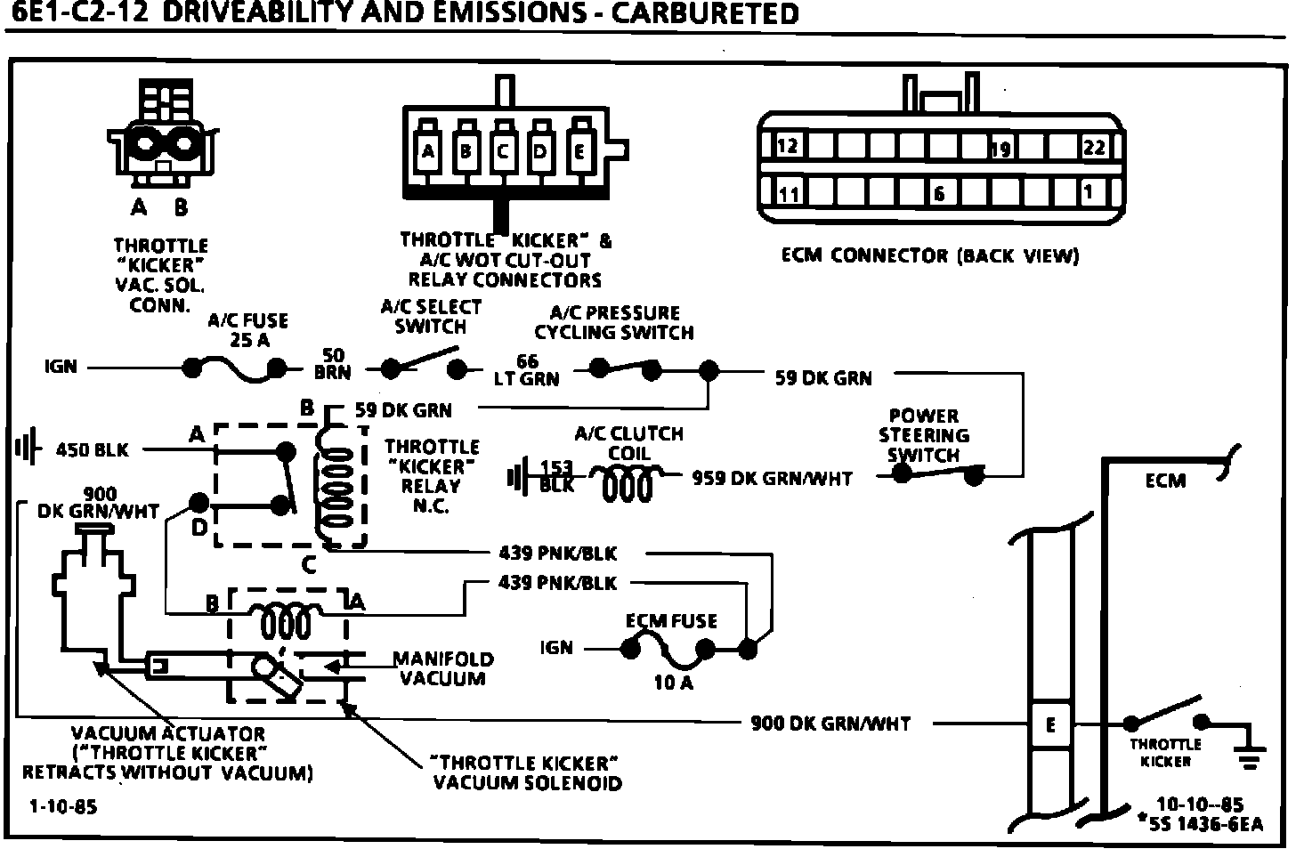 1. Checks ECM control of kicker solenoid and for an open in kicker relay cod circuit. TPS should be .30 volts with kicker solenoid plunger retracted and idle speed set to specifications. If TPS and idle speed are above specification, the ECM will energize the kicker solenoid.