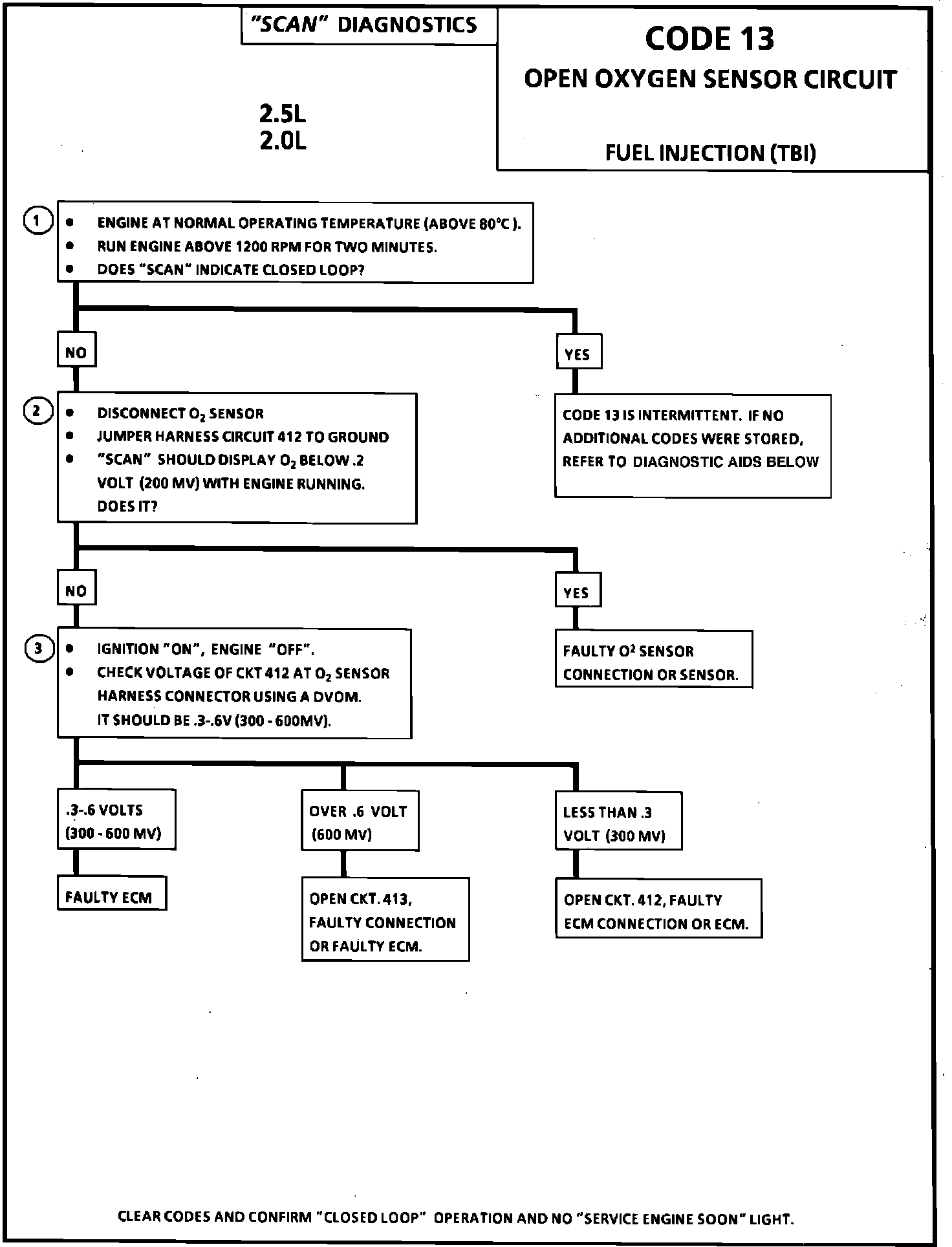 Diagnostic Aids: Normal "Scan" voltage varies between 100 mv to 999 mv (.1 and 1.0 volt), while in "Closed Loop". Code 13 sets in one minute, if voltage remains between .35 and .55 volts, but the system will go "Open Loop" in about 15 seconds.