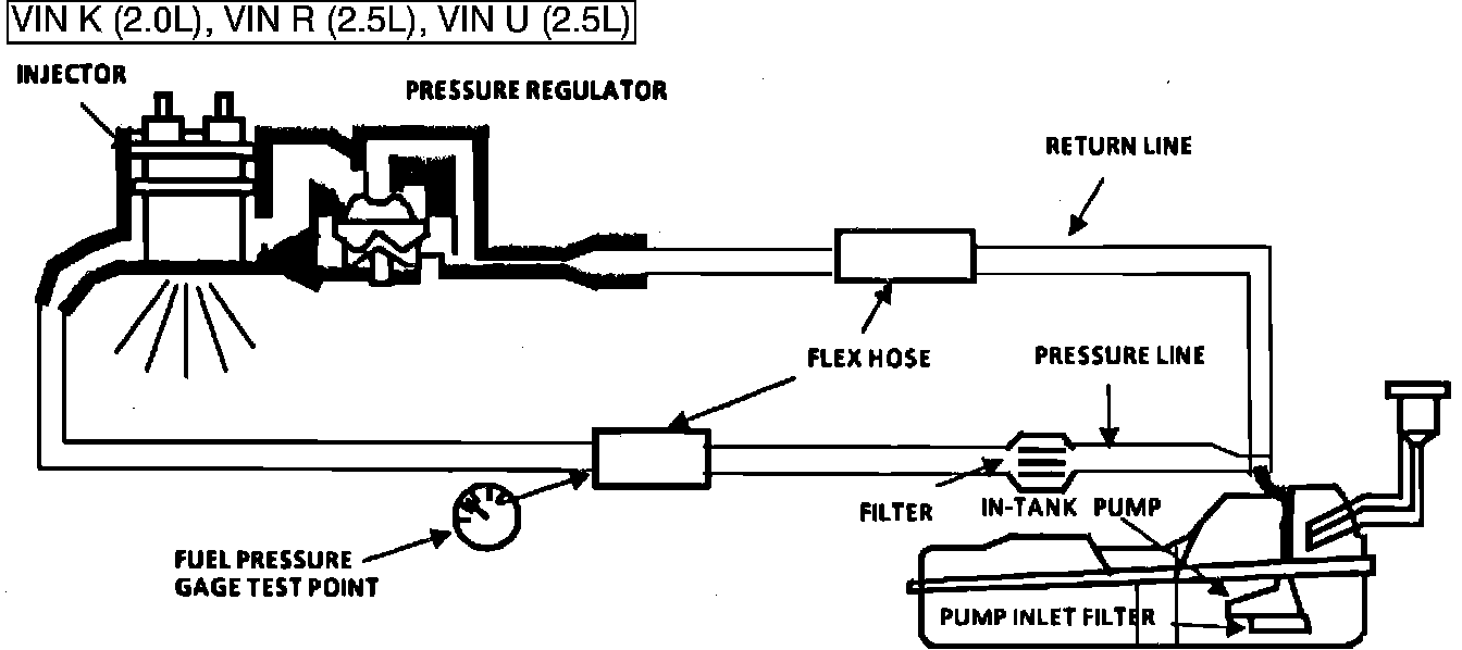 b. Restricted flow causing pressure drop - Normally, a vehicle with a fuel pressure of less than 62 kPa (9 psi) at idle will not be driveable. However, if the pressure drop occurs only while driving, the engine will normally surge then stop as pressure begins to drop rapidly to zero.