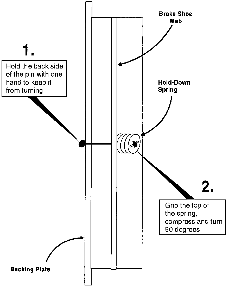 - With the thumb of one hand hold the shoe steady while reaching around the backing-plate to hold the retaining pin steady.