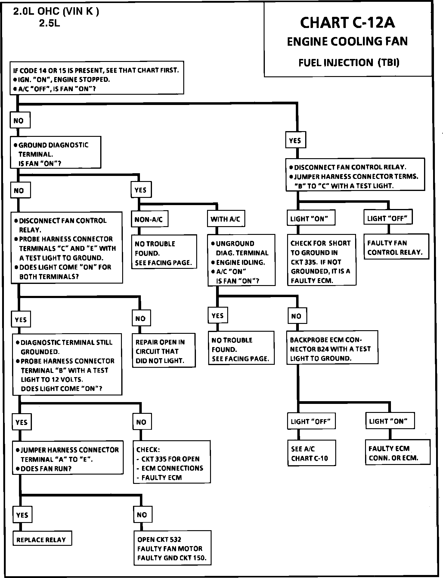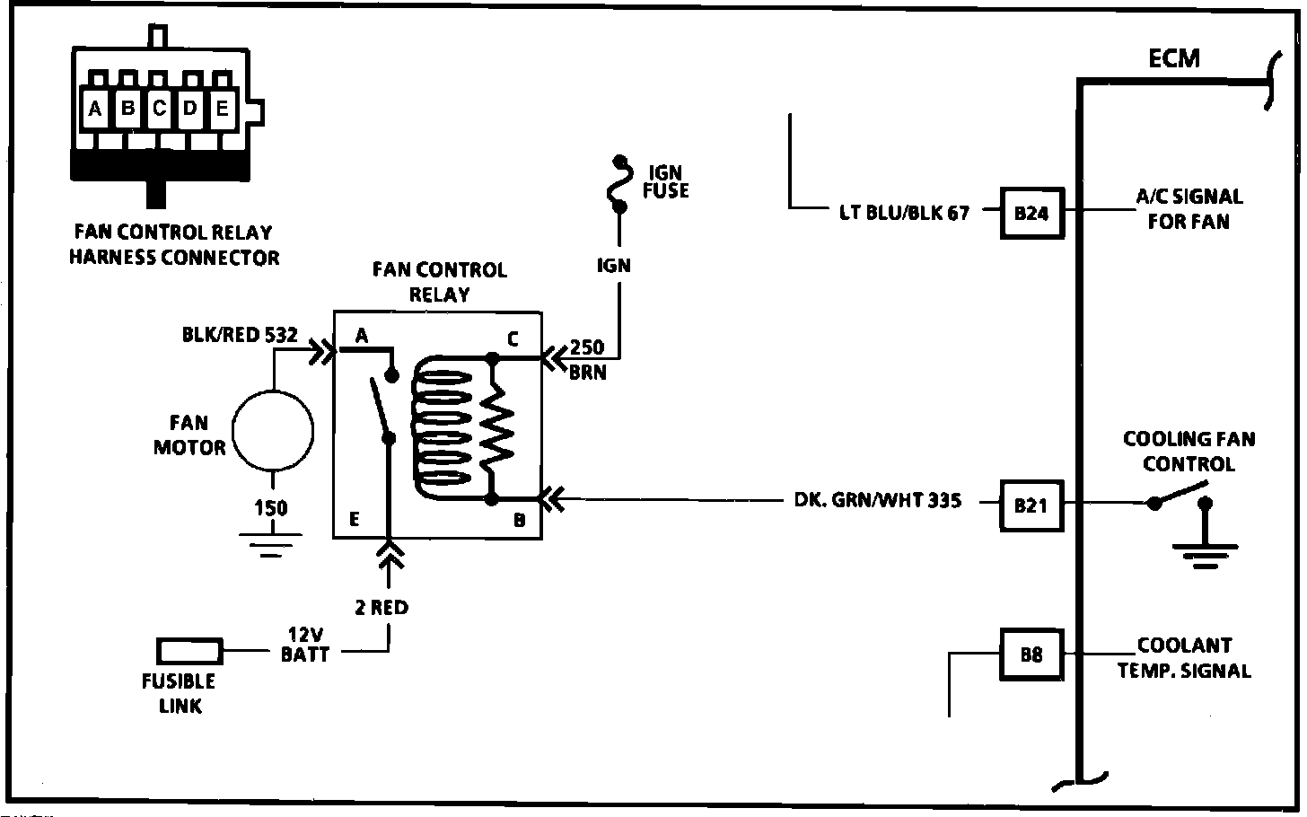 Circuit Description: Battery voltage to operate the cooling fan motor is supplied to relay terminal "E". Ignition voltage to energize the relay is supplied to relay terminal "C". When the ECM grounds CKT 335, the relay is energized and the cooling fan is turned "ON". When the engine is running, the ECM will turn the cooling fan "ON" if: