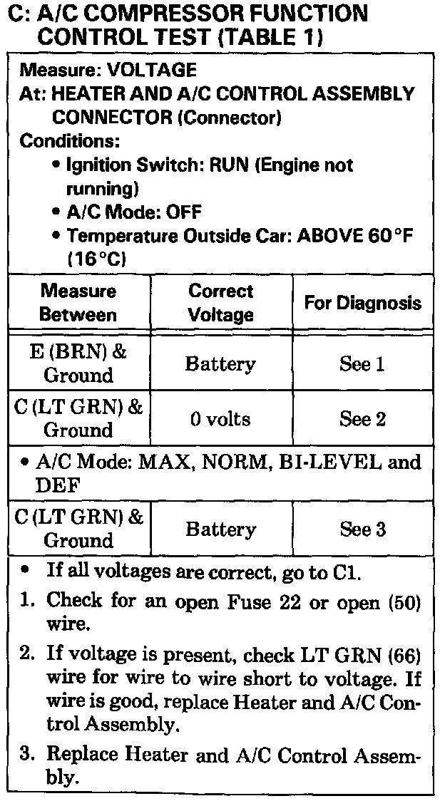 C1. Measure the voltage at terminal B of the A/C Compressor Control Relay with a fused jumper connected across the terminals of the A/C Low Pressure Cut-Out Switch connector (disconnected).