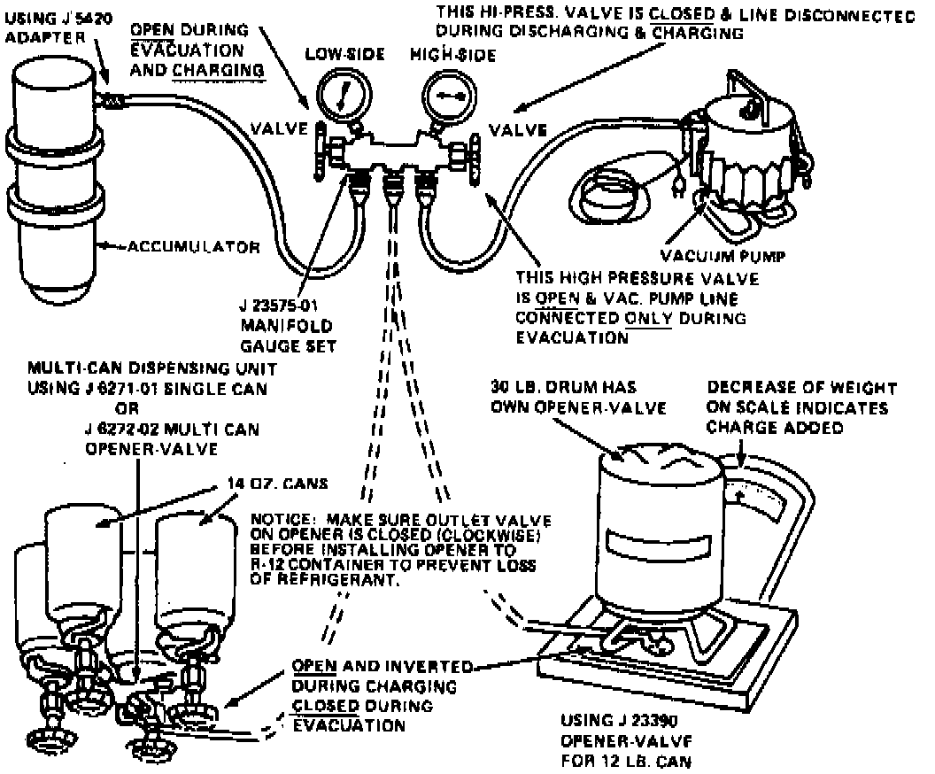 3. On models with display diagnosis, when 1 lb. of refrigerant has entered system, engage compressor by setting A/C lever to NORM and blower switch to HI to draw in remainder of charge.